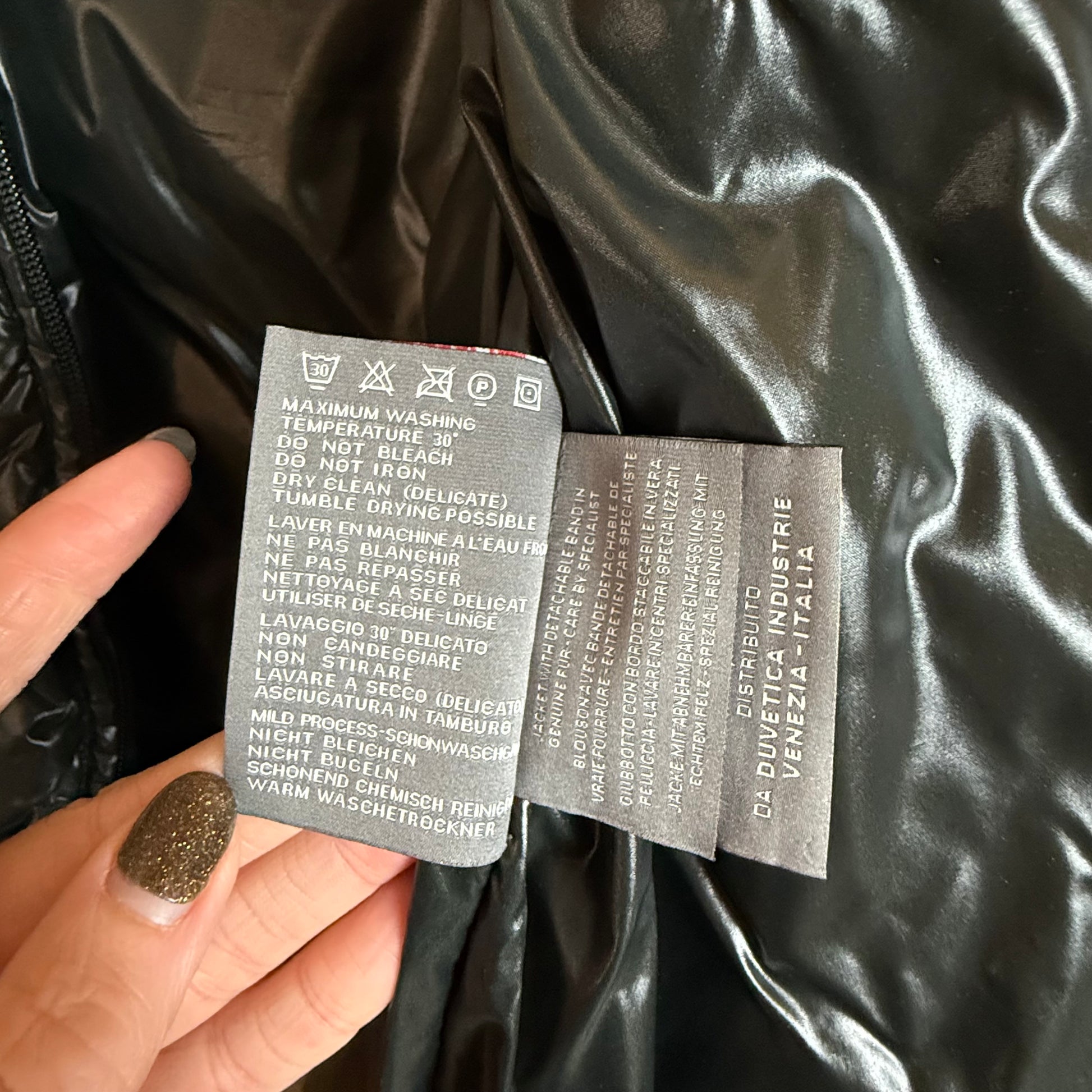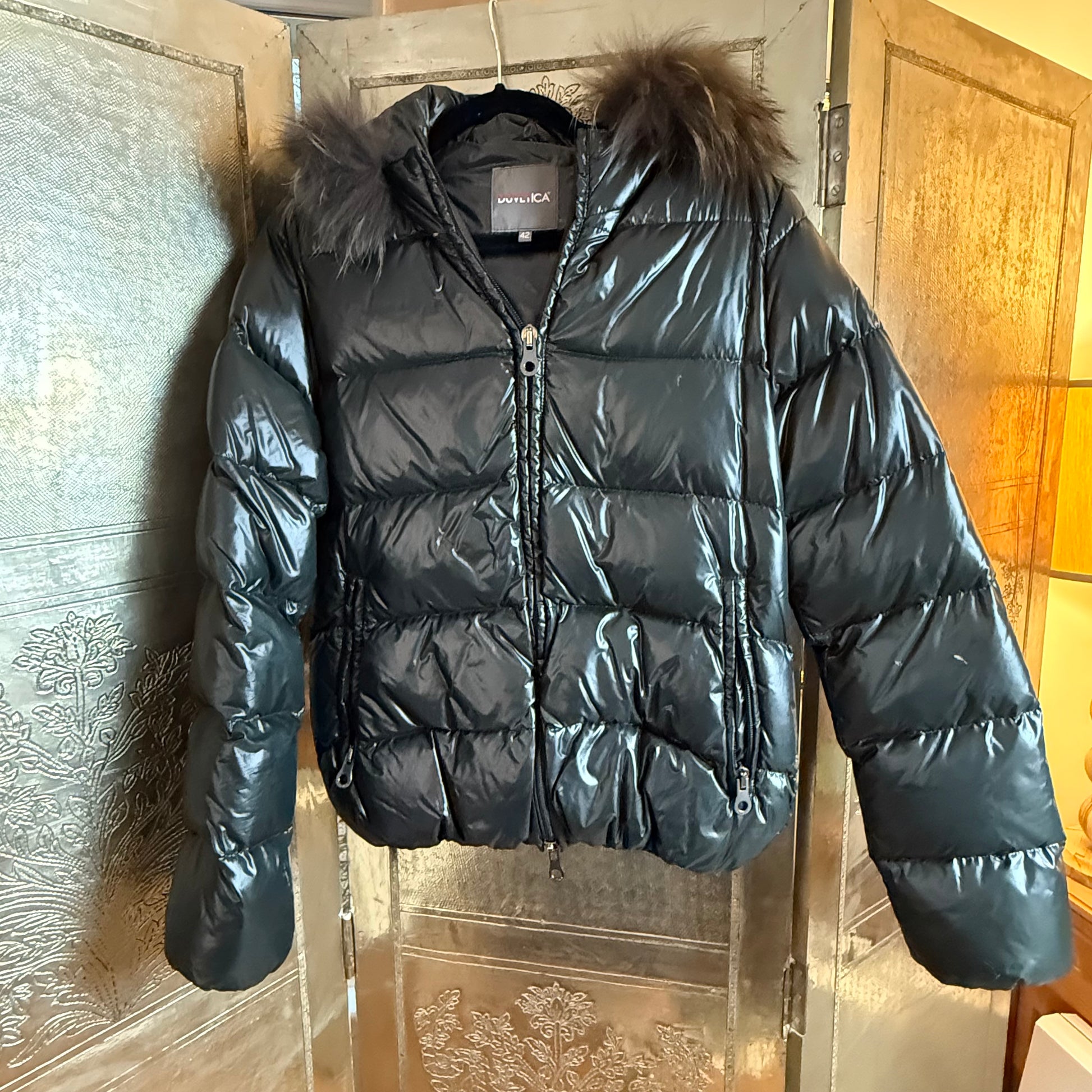 This is a stylish women’s Duvetica down puffer jacket featuring a glossy finish and a fur-trimmed hood. It is designed for warmth and comfort, making it ideal for winter wear.